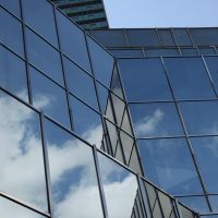 Mirropane is transparent on one side and reflective on the other. Its durable coating is applied at the factory by baking a layer of aluminum on grey tinted glass.